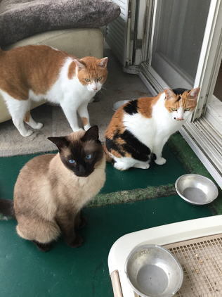 | 特徴(性格など) | 1 茶々(ちゃちゃ) 女の子 推定年齢 4歳 シャム猫で目は青色です。とても毛並みがよくて ふわふわしています。声は小さめで高くかわいい声をしています。 甘えん坊ですが少し臆病者です。 2 にいちゃん 男の子 推定年齢 6歳 みぃちゃんと兄弟 茶とら柄で凛々しい顔をしています。 いつも茶々をかわいがっています。高いところが大好き。 おとなしいです。 3 みぃ 女の子 推定年齢 6歳 にいちゃんと兄弟 みけ猫でとてもきれいな顔をしています。 にいちゃんと兄妹です。6匹の中で一番頭がいいです。 よくベランダの高いところから外を眺めています。 1・2・3の3匹は、同じ部屋で仲良く過ごしています。 4 こてつ 男の子 推定年齢 3歳 きじねこです。元気ものです。 外を散歩すると いつも一緒についてきていました。 ふうと兄妹でとても仲良しです。いつも2匹でかさなり合って寝ています。 5 ふう 女の子 推定年齢 3歳 こてつの妹できじねこです。こわがりさんで おとなしいです。かわいい顔をしています。 4・5の2匹は、同じ部屋で仲良く過ごしています。(耳カットあり) 6 ミー 女の子 推定年齢10歳 しろにうすい茶のぶちがいくつかあります。しっぽはしましま。 目は青色です。高いかわいい声で泣きます。 臆病者ですが、甘えん坊です。 ◆健康状態 良好。 過去、現在とも病気、風邪などはありません。 避妊・去勢済み。 ◆その他 こてつ・ふうの2匹は、子猫のときに家のそばに捨てられていたため、保護しました。 その時すでに4匹飼っていたため、地域猫として避妊・去勢をし、ご飯をあげていましたが、我が家にほとんどいたため室内飼いをすることにしました。 他の4匹は元々完全室内で飼っていましたので、現在は6匹共完全室内飼いです。 仲のいい兄妹などは一緒に飼っていただきたいのですが、1匹ずつでもかまいません。 とてもかわいがってきた猫たちです。 妻のためにも、この子たちのためになんとか里親さんを探してあげたいと思っています。 家族として最期まで大切にしてくださる方にお譲りしたいと思います。 お譲りする際はご自宅まで伺う予定です。 心優しい方、連絡をお待ちしています。よろしくお願いします。 |