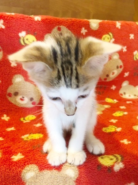 | 特徴(性格など) | 預かりさんにミルクで育ててもらっているため、人間が大好きで、歩くたびについてきます。少し困ったような表情がかわいいところです。ぜひ、のんたくんに会いにきてください。 |