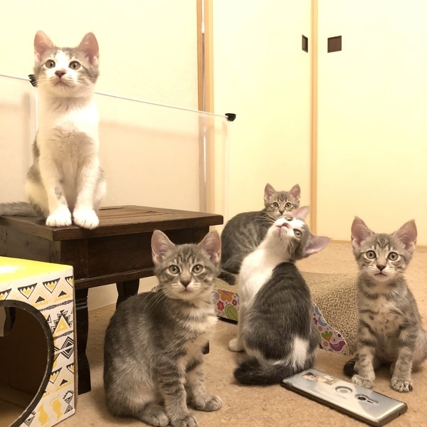 | 特徴(性格など) | 母猫のはるちゃんはとにかく人間が大好き、見かけると子猫そっちのけで駆け寄ってきます。 子猫もDNAなのか人間大好きです。 とても可愛らしい、5兄妹です。 個性は少しずつ出てきていますがとにかく甘えん坊ですので(あ、でも抱っこはそんなに好きじゃないですが膝には自然にのってきたりします)お世話だけでなくスキンシップをたくさんしていただけるご家族にお願いしたいです。 ママとペアなら多少お留守が長くても安心かと思います。 子猫同士ですと急な体調の変化に対応できるご理解のある職場かどうかなどによると思います。 兄妹の中でもダイくんとラクくんは一回り以上大きく、人間への興味も強く懐っこいです。 ずっと兄弟とママで暮らしてきましたし仲良しです。是非2匹ペアで迎えてください。 マレ:メス(グレーキジ) ミナ:メス(グレーキジ) ピコ:オス(グレーキジ、小さいママ大好き甘えん坊) ダイ:オス(グレー白、首元に蝶ネクタイの模様) ラク:オス(グレー白) ※大変嬉しいことに譲渡会のご縁でママとピコ、ミナともう1匹(オスいずれか)にご縁をいただきました。残りの2匹が9/22に参加となります。 健康状態 とても健康で元気です ママのウイルス検査(エイズ・白血病)陰性 ワクチン(1回) 駆虫 検便 シャンプー 爪切り 生後2カ月の子猫はワクチンの副作用、離乳時の胃腸の不調などでお届け予定がずれる場合やお届け後に体調が崩れる場合があります。 猫の経験など詳しくお聞きしてご相談させていただきます。 |