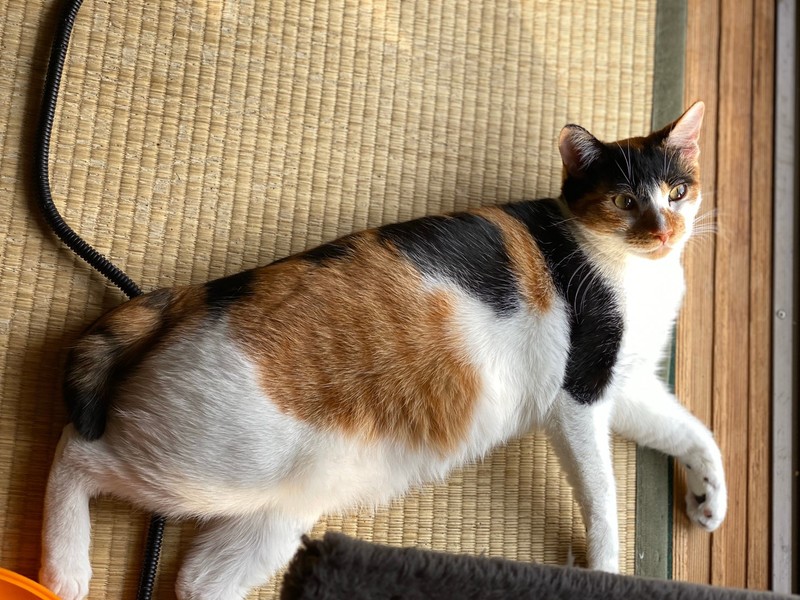 | 特徴(性格など) | 2019.4.27生まれ(推定) 毛色:三毛 とても個性的な柄の三毛猫ちゃんです。 お顔はほっそり、体もほっそり、手触りは柔らかく撫でているととても気持ちいいです。 表向きはしっかり者のお姉さんタイプですが、実は抱っこやなでなでが大好きな甘えん坊です。 初めて会った人にもベタ甘っぷりを発揮してくれるとてもかわいい女の子です。 |