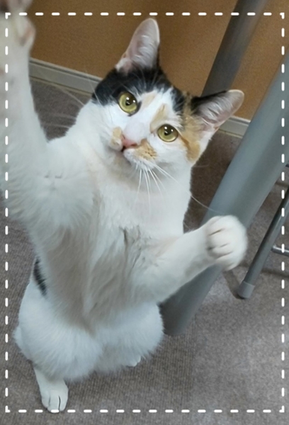 | 特徴(性格など) | 2019.4.27生まれ(推定) 毛色:三毛 眉間の模様のせいか、困ったお顔に見えちゃうかわいい三毛猫ちゃんです。 お顔はほっそり、体もほっそり、手触りは柔らかくいつまでも撫でていたくなる触り心地です。 甘えん坊で抱っこが大好き。 抱っこをすると喉をゴロゴロ鳴らしちゃいます。 初めて会った人にもベタ甘っぷりを発揮してくれるとてもかわいい女の子です。 |