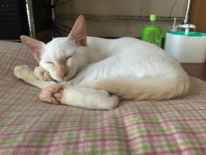 | 特徴(性格など) | 2019.5.9生まれ(推定) 毛色:白 しっぽクリーム 白いボディに少し青い瞳、耳と鼻・尻尾が薄茶色のシャム風の男の子です。 預かりボランティアのお家で多くの猫達と生活しているため、猫見知りも人見知りも殆どありません。 抱っこもできます。 寝る時は人や猫と一緒にくっついて寝る甘えん坊タイプ。 兄弟猫のひなたに比べると慎重派です。 |