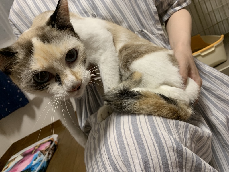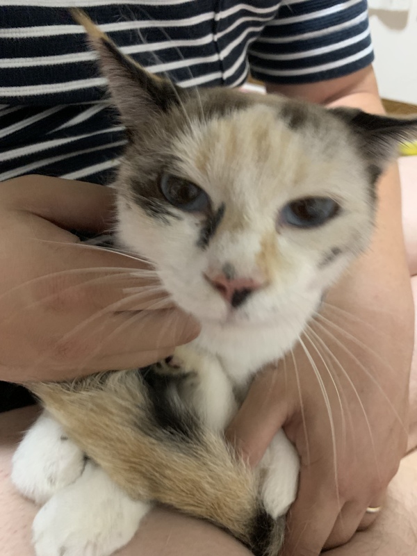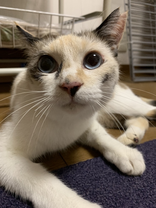 | 特徴(性格など) | ・淡い色合いの三毛猫 ・眼がブルー ・ビビリだけど人が好き ・愛情表現強め |