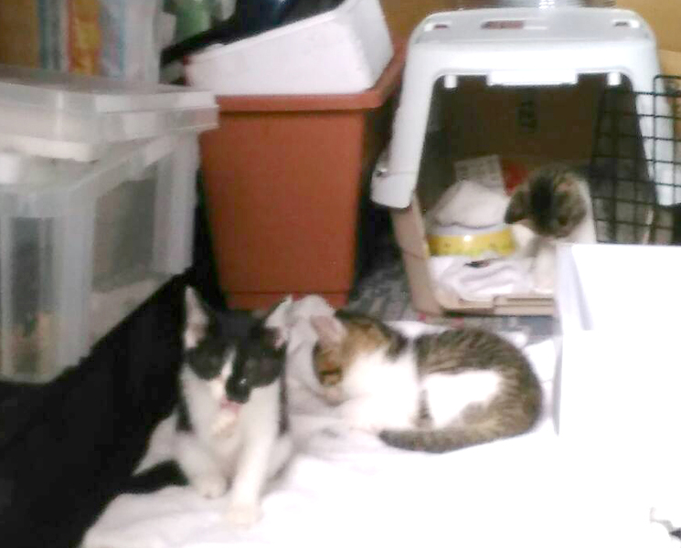 | 里親募集する理由 | 昨年、知り合いの庭で子猫が数匹生まれ、その場にいた2匹は昨年里親さんがきまりました。 しかし、他にも子猫がいたようで、今年はじめに、ふらっとその兄妹と思われるメス猫が現れ、 しばらくして出産してしまいました。 警戒心が強く子猫を手放しませんでしたので、 なかなか保護する事ができなかったのですが、なんとか保護する事が最近でき、 母猫の避妊手術を行ったようです。 ただ、ご主人が動物が好きでない様子で、 今月中になんとかしないと保健所に連れて行くと言われるようで、 私が相談を受けました。 |