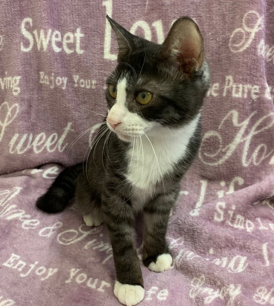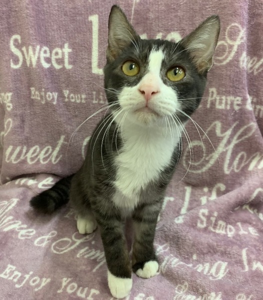 | 特徴(性格など) | 【仮名】クリオくん 【性格】なかなかめずらしい黒白ハチワレのトラ模様なクリオくん♪ 元気あり過ぎて遊ぶ時も大ハッスル♪ジャンプして走ってGO~(笑) 長くてリッパなしっぽをフリフリして飛び回っています(笑) でも抱っこも撫でられるのも大好きなので抱っこしてもらうとゴロゴロ言っちゃいます♪ 黒、グレー、白と珍しい三毛カラーです。 まだまだ遊びたい盛りなので同世代のにゃんことのお迎えを希望します♪ |