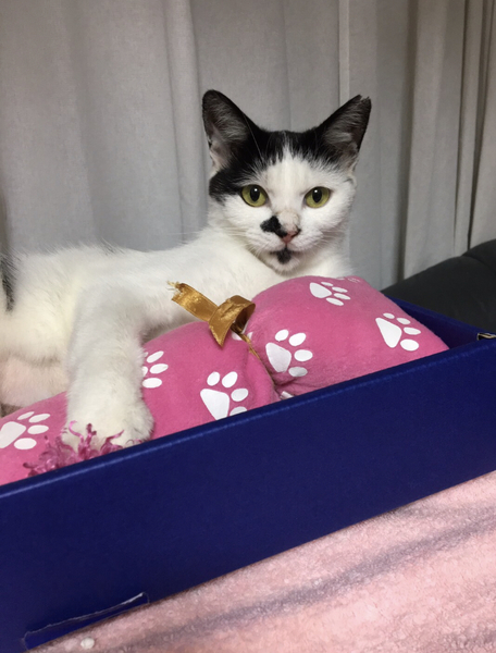 | 特徴(性格など) | ブチ。 口の周りがおちょぼ口のようにみえる愛嬌ある猫です |