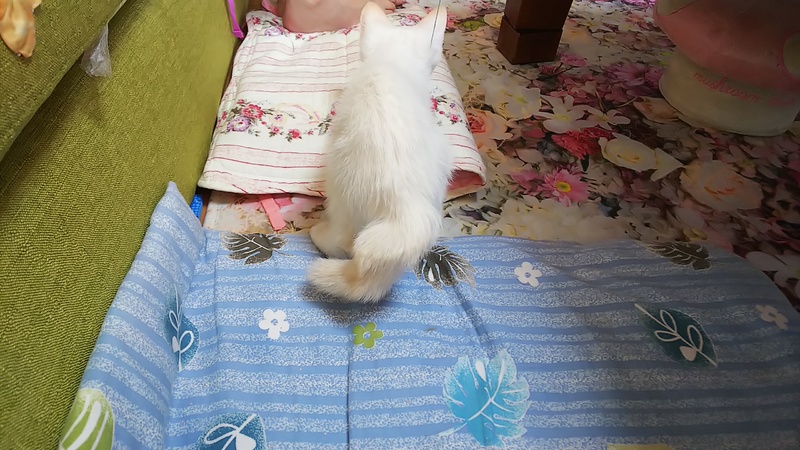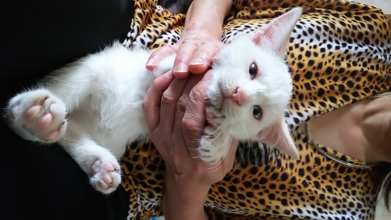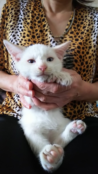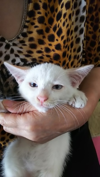 | 特徴(性格など) | 真っ白で尻尾が短く、曲がっています。目は青いです。人懐っこく後ろを着いてきます。 | ||