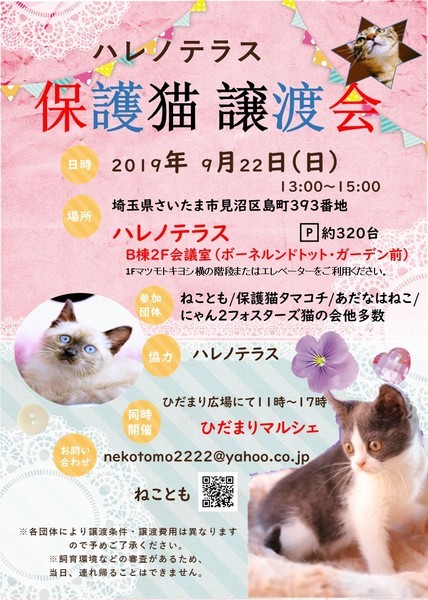 | その他(譲渡条件など) | 譲渡条件・募集範囲についてはホームページ(https://nekotomo.localinfo.jp/pages/3190427/page_201909061743)をご覧ください。 現在、特別な事情がない限り 個別でのお見合いは行っておりません。 譲渡会場にてお見合いをさせていただいておりますので、この子を希望の場合は 前もって メールにてご連絡いただけますようお願いいたします。【譲渡会場名もお書きください】 ※譲渡会場にどうしても来場できない場合は お見合いに伺いますが、お見合いで終わった場合も交通費はご負担ください。 ※お見合い希望の場合は前もって お問い合わせいただき、どこの譲渡会場でお見合い希望かをご連絡ください。(ご希望日前の譲渡会で決定している場合がございます。予めご了承ください) |