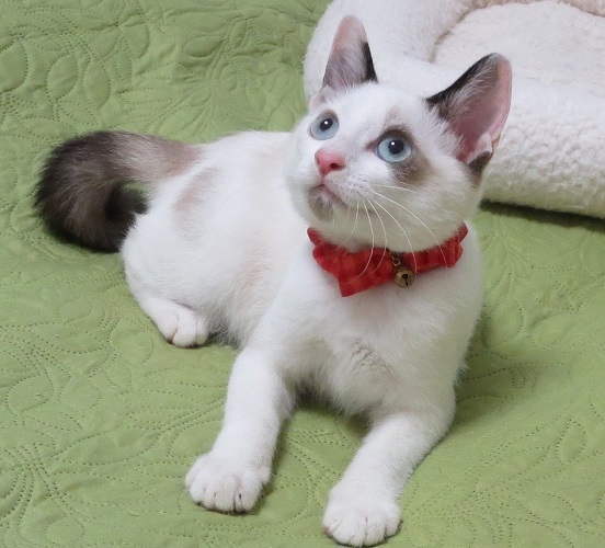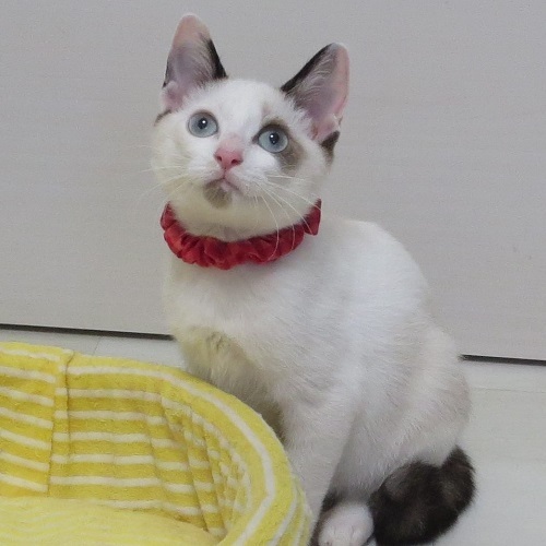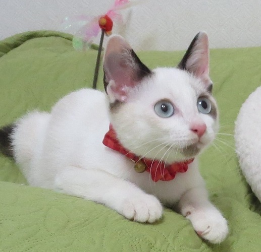 | 特徴(性格など) | 保護した時は触ることも出来ない子猫でした。怖がりな性格なのでまだ修行中の身なのですが、綺麗なブルーの目、身体には薄いベージュの斑点模様があって、今後が楽しみな容姿です。 オモチャへの反応はとても良くて遊びは大好きですので、これから頑張っていきます! |