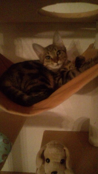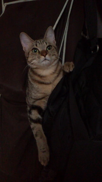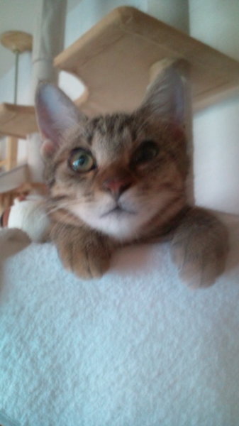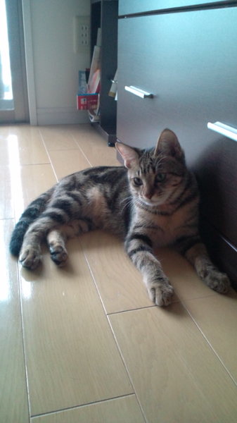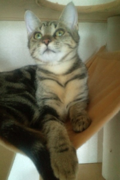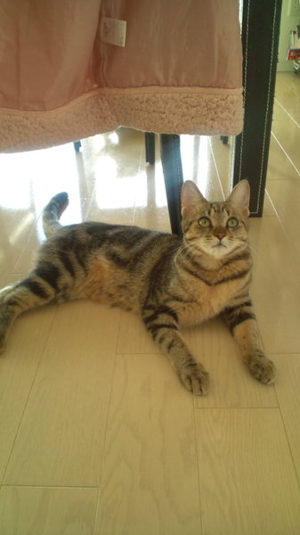| 特徴(性格など) | アメショータービー柄で成猫にしては小柄な体格です。用心深い、怖がりやさんですが、じゃらしで遊んで貰うのが大好きな活発な子です。 | ||