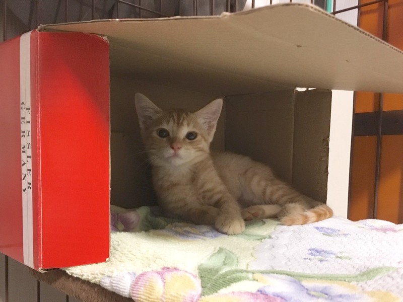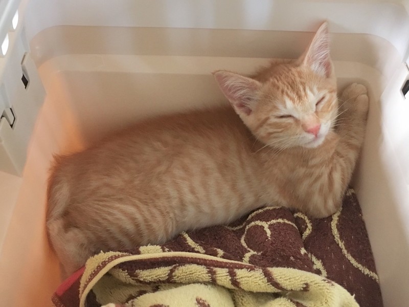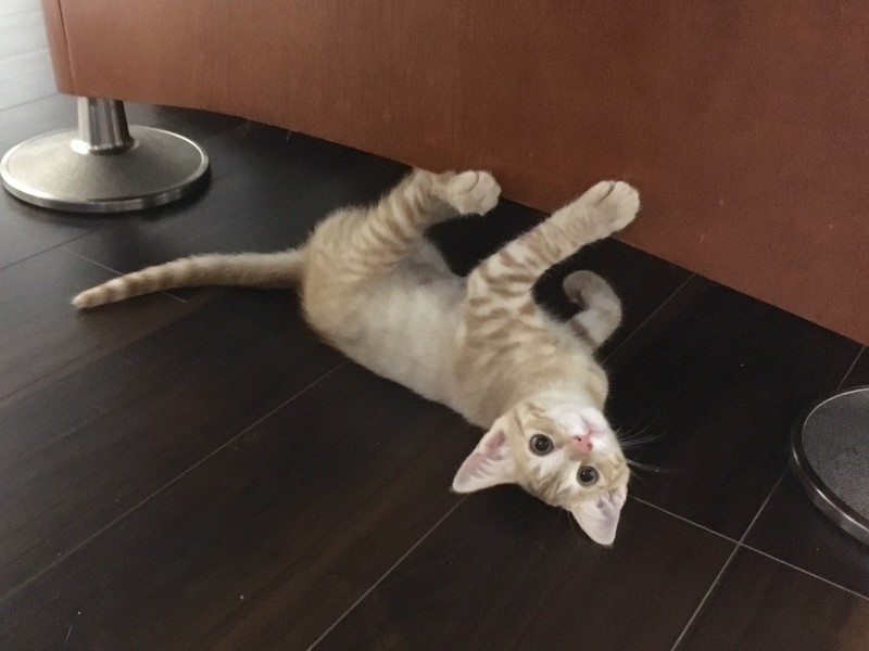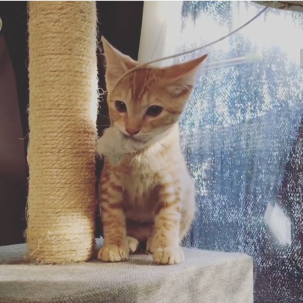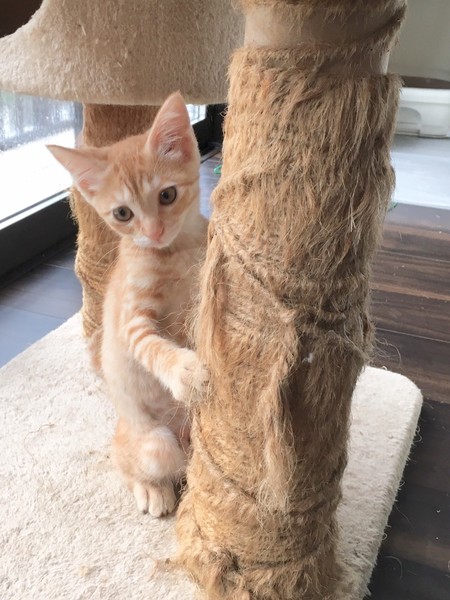| 特徴(性格など) | 2019.6.23生まれ(推測) 毛色:茶トラ 少し珍しい茶トラの可愛いい女の子です。 一緒に保護された子猫の中では一番小柄です。 ボールを渡すとくわえたまま、引っ張ってもなかなか離してくれない、ちょっと気が強いタイプ。 反面、年上の猫にからかわれるとすぐ助けを呼ぶ、守られたい一面もある可愛らしい性格です。 背中を撫でられるのが好きで、撫でるとゴロゴロと喉を鳴らします。 一緒に保護されたバノフィー♂が大好きで、いつもピッタリ寄り添って寝ている姿がとても愛らしいです。 |