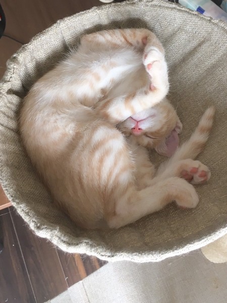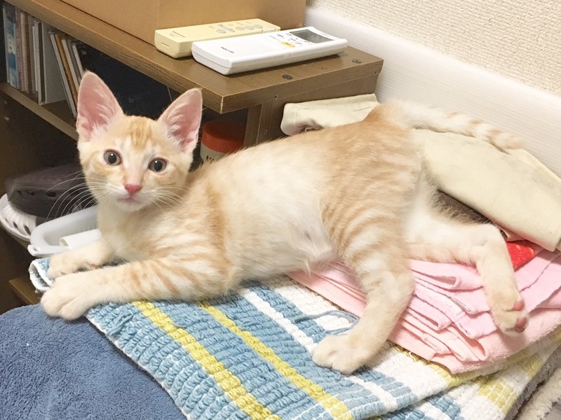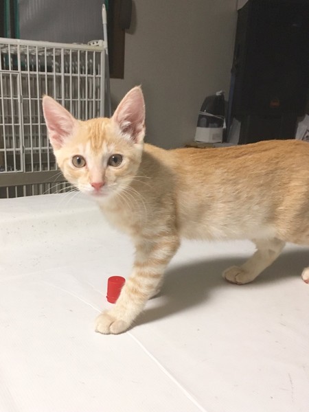 | 特徴(性格など) | 2019.6.23生まれ(推測) 毛色:茶トラ 少し薄目の茶色とつぶらな瞳が特徴。ボディのトラ模様はあまり目立たないタイプの茶トラ君。 好奇心が旺盛で、預かり宅に来た時、兄妹の中で誰よりも早く家の中を探検し、人馴れ・同居猫慣れも一番早かったそう。 普段は人の足にスリスリと頭や体をこすりつけてきて、撫でられるのが大好きな男の子。 一緒に保護されたパイ♀が大好きで、いつも一緒にくっついて寝たり、お互いを毛づくろいしたりと、とても愛らしい姿を見せてくれます。 |