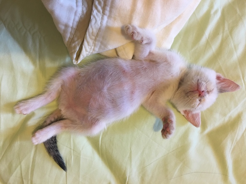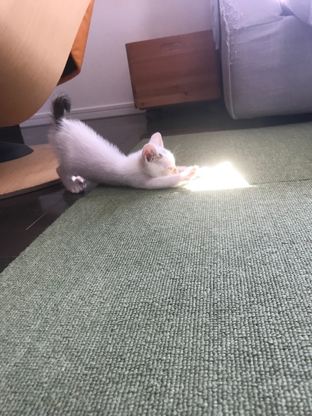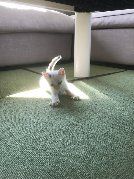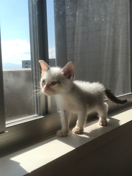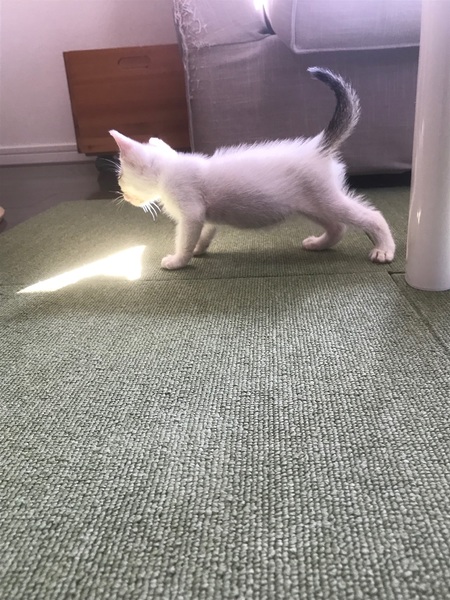 | 特徴(性格など) | 全身が白の子猫で、なぜかシッポが黒い可愛い女の子です。 頭に少し黒と茶色の模様があります。 食欲旺盛で、お腹が空くとニーニーと可愛く鳴きます。 ご飯を食べるとすぐに寝てしまいます。 近くで寝転んでいると、好奇心旺盛に乗ってきます。 兄弟姉妹の3匹で仲良く寝たり、ご飯を取り合ったり、よく遊んでいます。 健康状態は良好です。 保護した時は体重が250gしかなく、目もつぶった状態でしたが 動物病院に連れて行き、目薬と風邪薬、レボリューションをしてもらいました。 その後目の周りもほぼ綺麗になり、体重は490gまで増えています。 3匹の中で1番よく食べる子です。 まだ小さすぎて血液検査はできていませんが、 TNRした母猫はエイズ・白血病とも陰性でした。 |