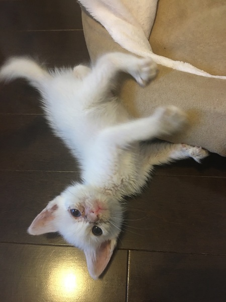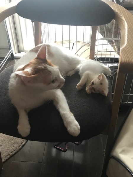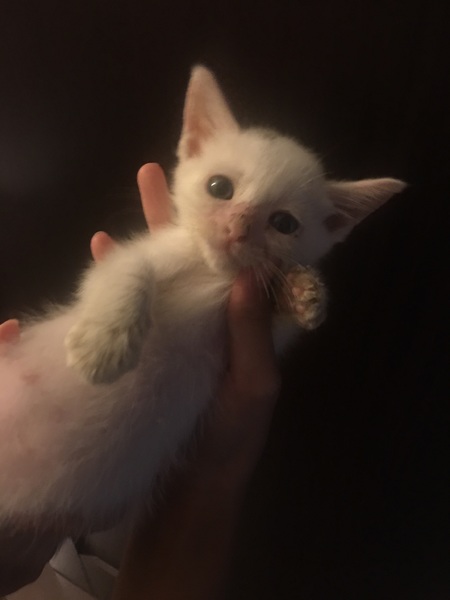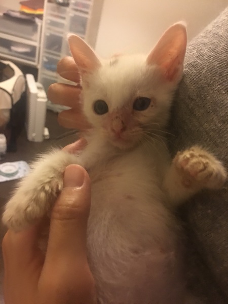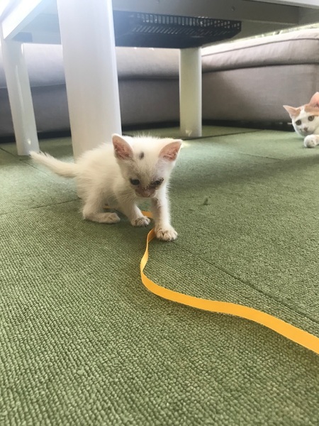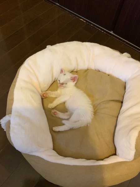 | 特徴(性格など) | 全身が白の子猫で、頭に少し黒の模様があります。 食欲旺盛で、お腹が空くとニーニーと可愛く鳴きます。 3匹の中で1番食べるのがゆっくりしています。 他の兄弟に取られそうになることもあるので、守っています。 ご飯を食べるとすぐに寝てしまいます。 兄弟姉妹の3匹で仲良く寝たり、ご飯を取り合ったり、よく遊んでいます。 1番小さい子猫なので、えこひいきしてしまいます。 顔の肌荒れはまだ残っていますが、健康状態は良好です。 保護した時は体重が230gしかなく、目もつぶった状態でしたが 動物病院に連れて行き、目薬と風邪薬、レボリューションをしてもらいました。 体重は380gまで増えています。 まだ小さすぎて血液検査はできていませんが、 TNRした母猫はエイズ・白血病とも陰性でした。 |
