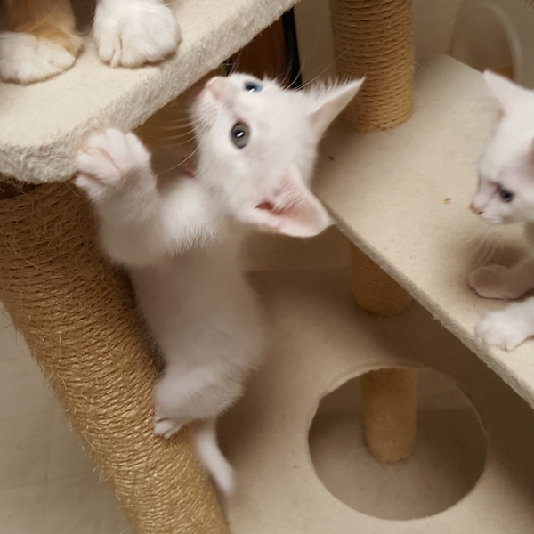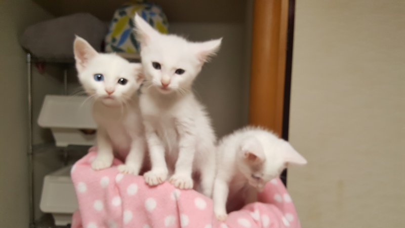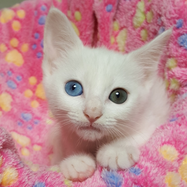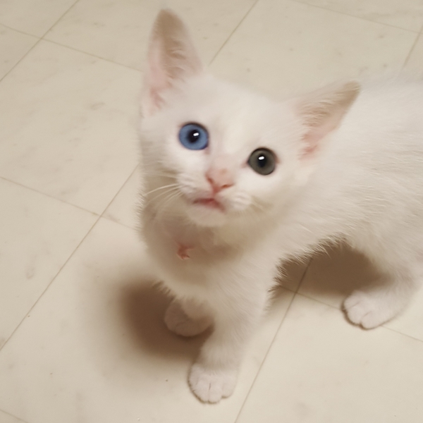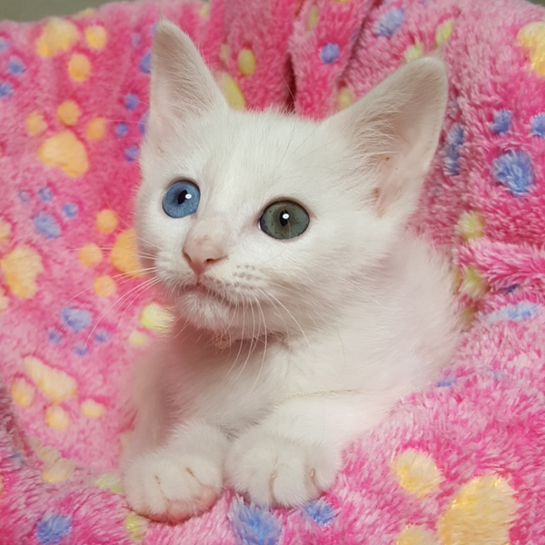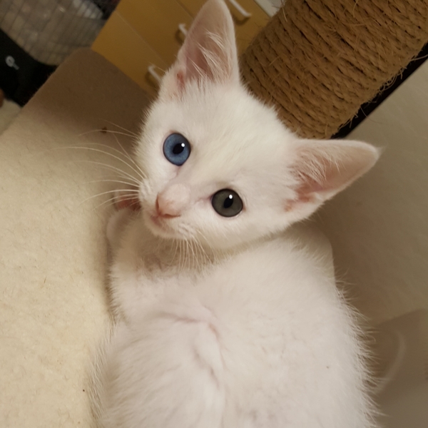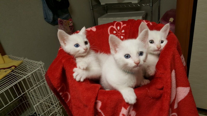 | 特徴(性格など) | 仮に「スフレちゃん」と呼んでいます。 オッドアイの綺麗な女の子です。 乳飲み子から人が育てましたので、ゴロゴロの甘えん坊さんです。 部屋に入ると、にゃーっと寄って来て、お膝に乗ったり肩に乗って、ゴロゴロです。 ムース君、マフィン君と兄妹で、兄妹で元気一杯遊んでいます。 兄妹でもらって下さる方大歓迎です。 預かりブログです。http://jojo148.blog93.fc2.com/ |