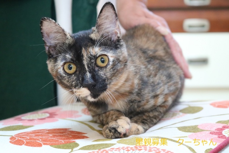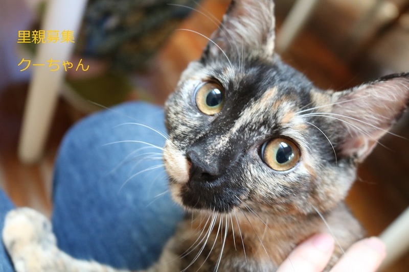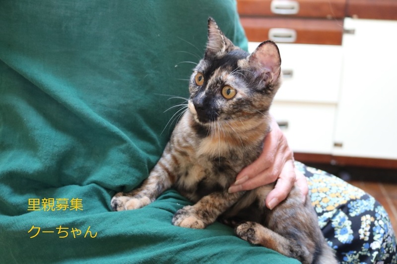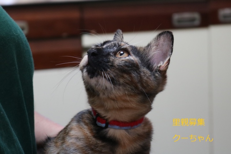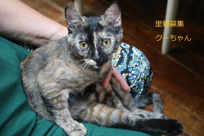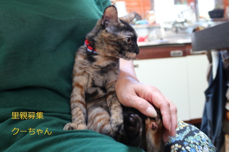 | 特徴(性格など) | さび子猫、女の子、仮名:クーちゃん 推定生後4か月くらい、体重:2.2㎏(9/19現在) 健康診断済み、駆虫済み、 血液検査-エイズ・白血病-陰性(7/20) 三種混合ワクチン接種済み(7/20、8/13) トイレしつけ済み 最初は少し警戒心がありますが、 ゴロゴロスリスリの超甘えっ子です。 |