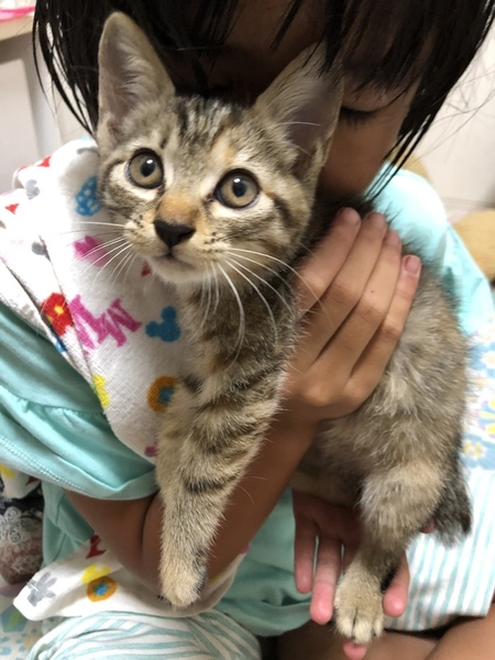 | 里親募集する理由 | 近所で車に引かれそうになっていたところを保護しました。 動物病院で診察したところ、目ヤニ・猫風邪・ノミ糞なく、毛並み状態も綺麗なので、元々家猫で生まれた子が捨てられたか、脱走してはぐれてしまったのではとの事です。 親猫と離れてからの栄養状態が悪く通常の半分(500グラム)しか体重がありません。 保護してからは食欲旺盛です。 病院ではノミ駆除をしてもらい、次回は便検査とワクチンをする予定です。 自宅では4匹の先住猫がいるため募集します。 |