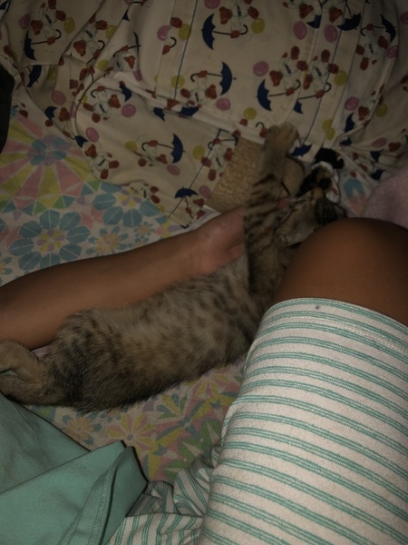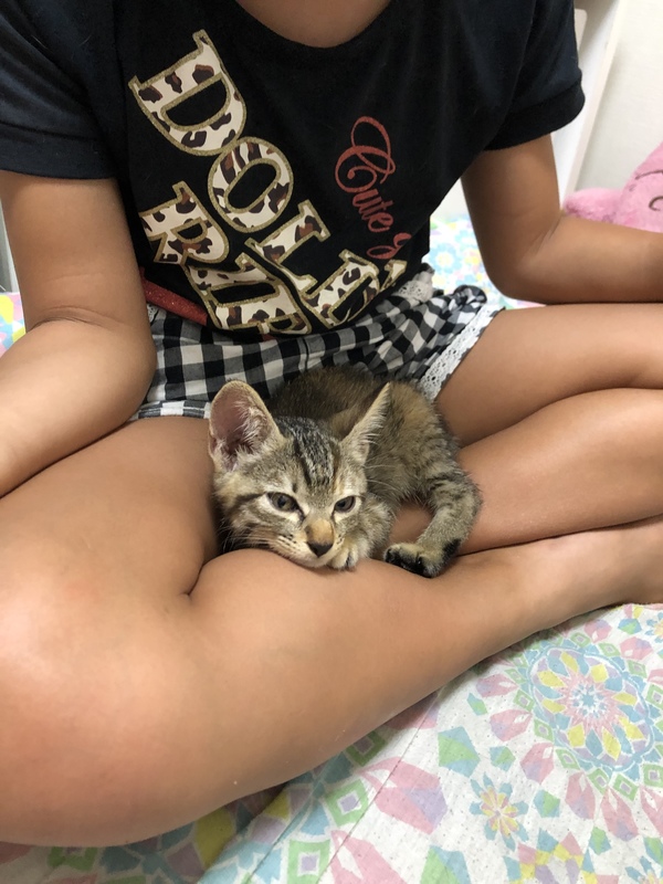 | 特徴(性格など) | 保護してまだ警戒しているようですが、人恋しいのか、撫でるとゴロゴロしたり、膝の上に乗ってきたり、娘の腕枕で寝たりと、慣れたら甘ったれな子になるのでは思います。 全身キジ柄の鍵尻尾です。 |
