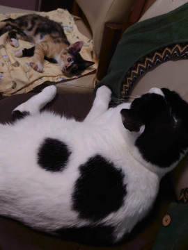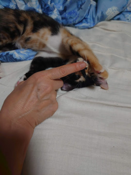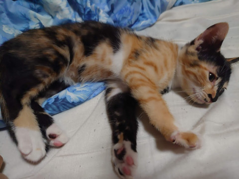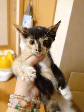| 特徴(性格など) | 好奇心旺盛で人なつっこい女の子、サビと三毛、茶トラが混ざった柄です。 前脚の柄が左右非対称(黒ソックスと茶トラソックス)で、「ブラックジャック」と呼ばれる珍しいものらしいです(動物病院でDrが集まって観察してました) とても運動神経が良く、すばしっこいので遊ぶのが大好き、先住猫さんがいれば追いかけっこすると思いますし、飼い主さんと遊ぶのもおもちゃで遊ぶのも大好きになると思います。 結構寂しがりなので遊ぶ時間を作ってくれる方が希望です。 今は大丈夫ですが、体が成長していくときにはドアの開け閉めなど、不意の脱走にご注意ください。 ワクチン、軽い健康診断済みです。こちらの費用は請求致しませんのでその分この子を育てていくのに使って下さい。 もし飼育に不安がある場合はご相談にものりますし、お試し期間も可能です。 |