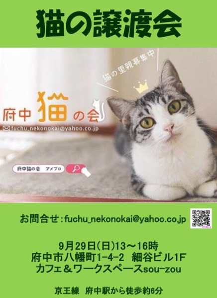 | その他(譲渡条件など) | ◆譲渡会案内◆ ♠︎9月29日(日) ♠︎13時〜16時(15時30分まで受付) ♠︎会場は【カフェ&ワークスペース sou-zou】 (譲渡会場が今までと違う会場に変更します。必ずご確認ください) ・京王線【府中駅】から徒歩6分 ・駐車場はございません。 ・お車でお越しの方は最寄りのパーキングにお願いします。 ・自転車を止めるスペースがないので、お近くの府中駅東自転車駐輪場をご利用ください。日曜日、祝日は、無料です。 ※会場へ直接のお問い合わせは、ご遠慮ください。 fuchu_nekonokai@yahoo.co.jpまで。 【カフェ&ワークスペース sou-zou】 http://sou-zou.jp/ ―――――――――――――――――――――――――――――― ※譲渡会にお越し頂いた方を優先に譲渡したいと考えております ※譲渡会は予約制ではございません。また、先着順ではなく、希望者様の中から選考とさせて頂いております 【お願い】会場への直接の問合せはお控え下さい。必要な場合は、府中猫の会へ原則mailでお願い致します。 ※猫ちゃんの体調等、最新情報はblogに掲載しますので、適宜checkをお願いします! http://ameblo.jp/team-rose-cats/ ▲応募条件 ・ペット可の住宅。 ・完全室内飼い(脱走防止に配慮いただける方) ・定期的な健康check(必要な医療処置を含む) ・終生飼育(ご高齢または単身の方は、後見人相当の方のご同意をお願いします) ・ワクチン、去勢避妊の医療費(証明書類を提示またはお渡しします)を負担いただける方 ※リクエストに応じ環境に慣れるまでの間、ケージを無償レンタルすることも可能です(数に限りがあるので、その点ご承知ください) ▲応募可能地域 埼玉県南東部、東京都、神奈川県北東部. 移動による猫の負担を考慮し、調布飛行場から40km圏内にお住まいの方 詳しくは譲渡会場にてお尋ね下さい。 ※対応をスムーズに行うため、飼育経験,ご家族構成,応募の動機など、簡単なアンケート(当日配布)にご協力ください ※当日の引渡しではなく、後日ご自宅へお届けとなります ※当日ご来場不可の方は、開催日以降にmessage機能または、mailでお問合せ下さい。 |