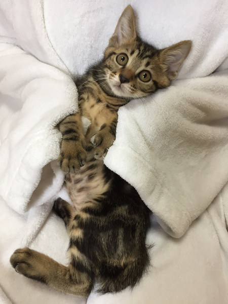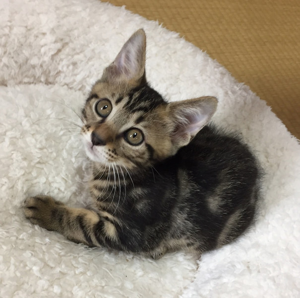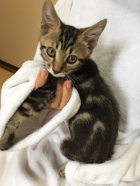 | 特徴(性格など) | ボクちんは、しょう太くんだおー 毎日元気いっぱい悪さ遊んでいるんだおー キョウダイ達と仲良しだから、いつも仲間たちと一緒に家中を駆けずり回ってるよ! あにょね、ボクね、単純だから、直ぐにおもちゃに釣られちゃうんだお キョウダイの中では、一番好奇心旺盛かもね そんなボクちんを、よろちくおねがいしますにゃ! ―――――――――――――――――――――――――――――― 人懐っこくて、好奇心旺盛!アメショ柄の入った元気なオス猫くんのご紹介です。 この子達は4キョウダイで保護しました。 小さなうちに保護したので、人には慣れております。 同じく譲渡会に一緒に出場するのぞみちゃん、チャロくん、かなえちゃんがキョウダイです。 しょう太くんが、キョウダイの中では一番体が大きいです。 遊びがとにかく大好きで、おもちゃに直ぐに反応してくれる単純な子です(笑) 家庭生活にもすっかり慣れておりますので、ケージなどは必要ありません。 飼いやすい子達ですので、猫飼い初心者の方にもおススメできます。 小さなお子さんがいるご家庭でも大丈夫です。 半日ぐらいのお留守ならば可能ですので、パートタイムをお持ちのご家庭など問題なく迎えていただけます。 可能であれば、キョウダイ仲良しなので、2匹で迎えてくださるとありがたいです! 子猫の場合は、2匹一緒だと遊びあってお留守したりできるので、利点も多いです。 かわいい子達なので、ぜひ、よろしくお願いします。 |