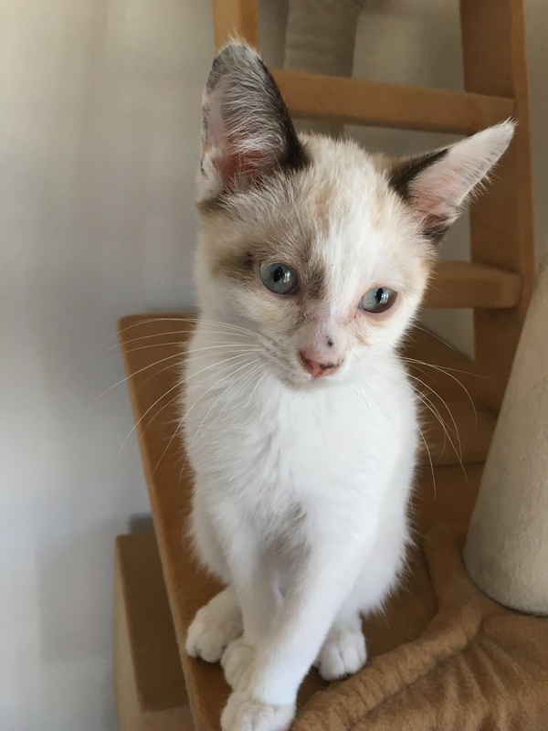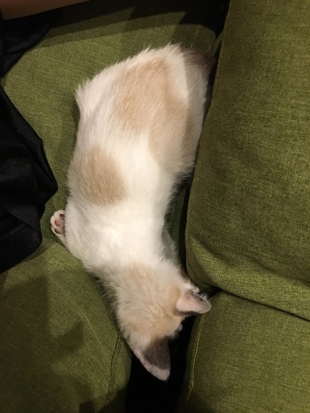 | 特徴(性格など) | 2ヶ月半の男の子です。 毎日元気にオモチャにじゃれたり、走り回ったりしています。 甘えん坊で、人間大好きです。 目はブルー、シャム系の猫です。 幸運をひっかけてきてくれると言い伝えのある、鍵しっぽです。 ご飯はカリカリを沢山食べます。 トイレも猫砂できちんと出来ます。 猫風邪をひいている様子だったので、病院へ連れて行き、一週間効果のある抗生剤を投与して頂き、目薬が処方されました。 まだ、多少の目ヤニは出ます。 目ヤニを綺麗にとってあげ、目薬を投与しております。 |