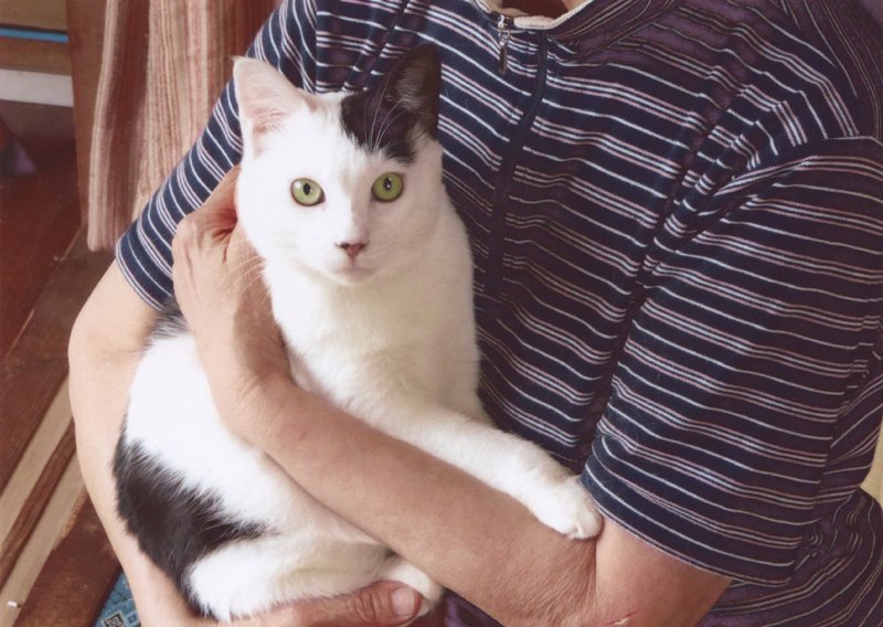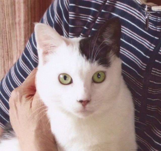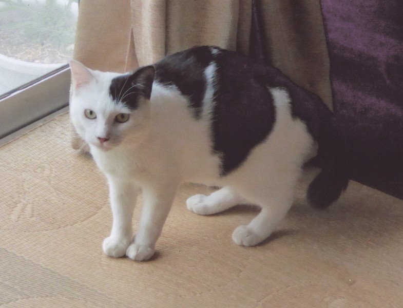 | 特徴(性格など) | 白黒ブチのホルスタイン柄で、尻尾は短めです。ピンクの鼻の一部がちょっとだけ黒です。人が大好きで、抱っこも自由自在です。 健康状態は良好です。保護してからよく食べるので、福々しい感じになってきました。猫エイズウイルスキャリアですが、これはあまり深刻な問題ではありません。エイズウイルスキャリアでも、完全室内飼いでストレスの無い環境なら、長生きして天寿をまっとうする子はたくさんいます。でも、病気や怪我をすると、キャリアじゃない子よりも治るのに時間がかかるということがあるので、その点に注意して、普段から病気や怪我をしないように気を付けていただければと思います。 |