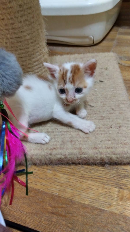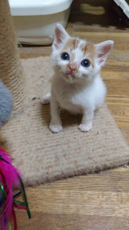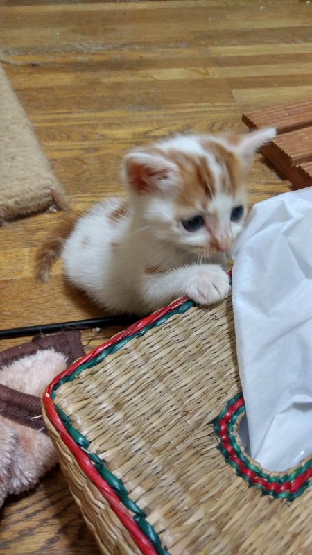 | 特徴(性格など) | 約生後1ヶ月です。 可愛く甘えたで、ヨチヨチ後をついてきます。 全体白に茶色のぶち模様があります |