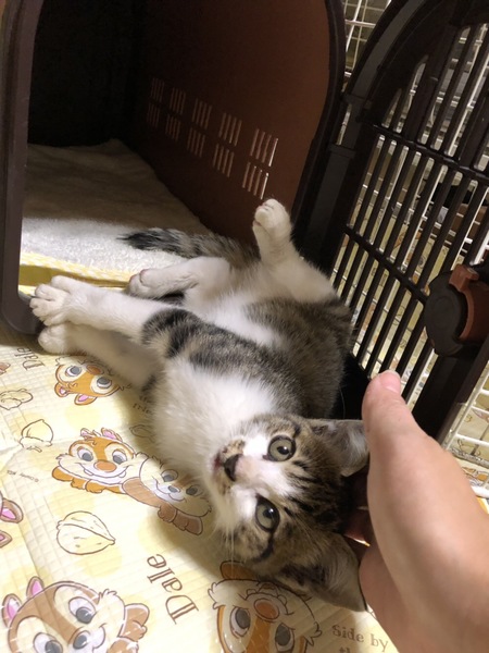 | 里親募集する理由 | 職場の駐車場で、車のエンジン部分に潜りかけているのを見つけて保護しました。事故にでもあったのか、保護直後はお腹の部分が内出血していたり、シッポの先もケガをしていましたが、病院で診てもらい、日に日に治ってきています。今現在も元気に過ごしており、お渡しする頃には健康な状態で譲渡できると思いますm(._.)m | ||