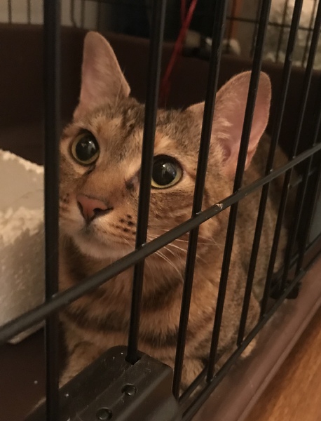 | 特徴(性格など) | 綺麗なキジトラちゃんです。 保護当時から人馴れしておらず、かなり攻撃的でしたが、1ヶ月してようやく爪を出しての攻撃をしなくなり、足元にスリスリするようになりました。頭を叩かれる等の虐待に合った可能性があり、手のひらが頭の上から近づくと異様に怯えます。時間はかかるかもしれませんが、慣れたらかなりの甘えん坊さんになりそうな気配です。 |