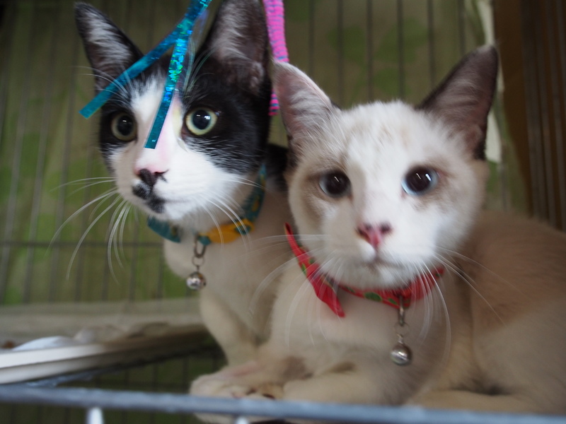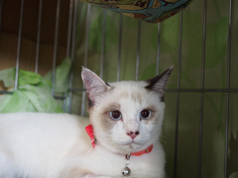 | 特徴(性格など) | 白いボディに所々茶色のポイントが混ざっていて薄いブルーの目が素敵な女の子。 同時に保護した兄妹より少し臆病かな、と思われる事もありますがとても元気一杯でおてんばです。呼ぶと可愛い声でお返事も出来 臆病ながらも人にはよく慣れている女の子です。 一緒に保護した兄妹の男の子とはとても仲が良く出来たら2匹一緒の譲渡を希望しています。 |