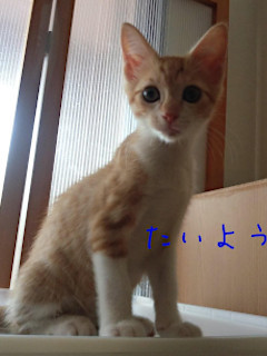 | 特徴(性格など) | 仮称を『たいよう』といいます。 茶白の男の仔です。 保健所収容猫です。 くきっと曲がった幸運を引っ掛ける♪カギしっぽと、ちょっぴりへの字口が可愛い男子です。 兄妹の面倒を見たり、ご飯を譲ってあげる、性格の優しいたいようです。 肩によじ登るのが大好きです! 三兄妹で肩と頭によじ登って遊ぶので乳母の首が限界です。(笑) 愛らしさいっぱい。笑いや幸せを運んできてくれることでしょう。 大人猫も仔猫も、もちろん人も大好き! 名前呼んだだけでゴロゴロ言っちゃいます。 苦手なものは掃除機です。 脱兎の如く消えてゆきます・・・ お留守番(常識の範囲内での)トイレも完璧です。 【医療処置情報】これから実施のも含まれます *健康チェック *3種混合ワクチン接種 *ウイルス検査実施(FIV.FeLV共に陰性) *検便実施 *駆虫薬投与(レボリューション、ドロンタール) *マイクロチップ装着 *不妊・去勢手術 |