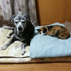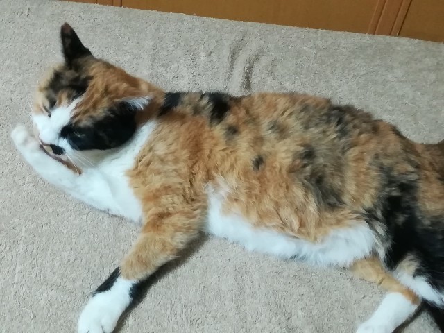 | 特徴(性格など) | 推定ですが年齢は13歳~くらい。 尻尾の長い、三毛猫です。 おとなしくて人懐っこい性格。 抱っこはあまり好きではないですが、常に人の側にいたいタイプ。 甘えっこです。 一日の大半は寝ています。 歯はほとんど抜けています。 ちょっと鼻炎気味。 時々消化不良で吐いたりします。 ご飯はドライフード(生タイプは好きではないです)。 |