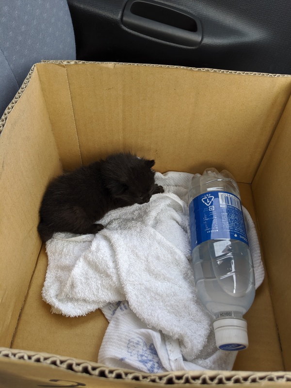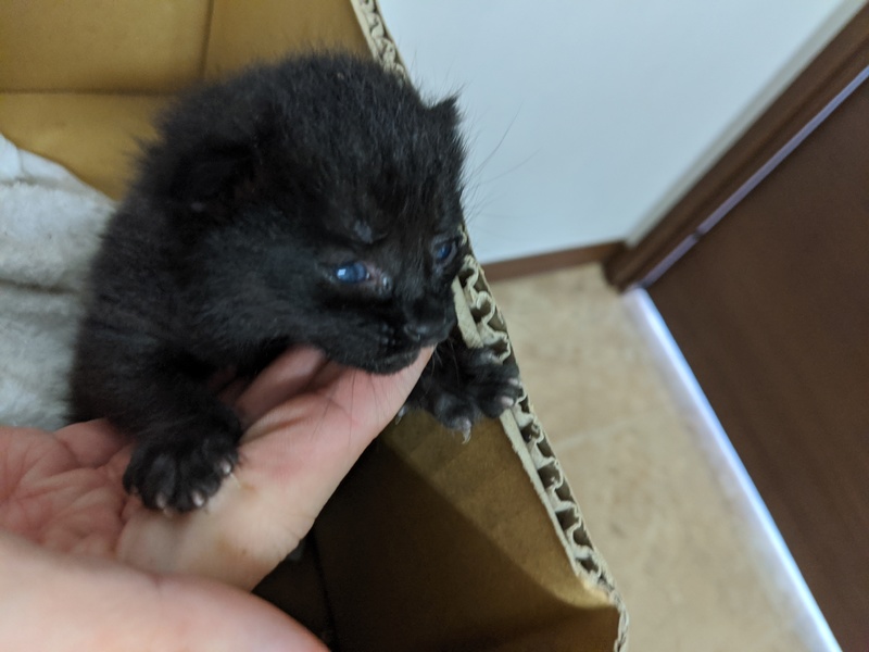 | 特徴(性格など) | 黒色、若干赤っぽさもあり。毛はふわっとしています。とても元気にミャーミャー言っています。 病院で見てもらいましたが、まだ産まれて間もないので性別は不明とのこと。 ダニ、ノミ駆除済み。 病院曰くとても元気とのことでした。 とてもかわいいです。 |