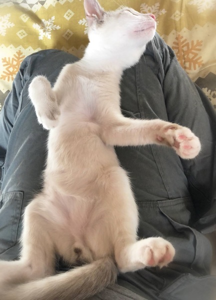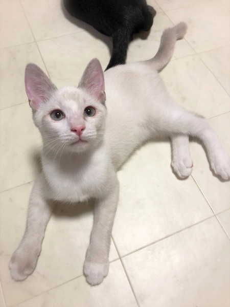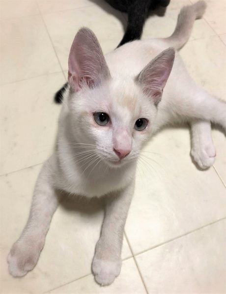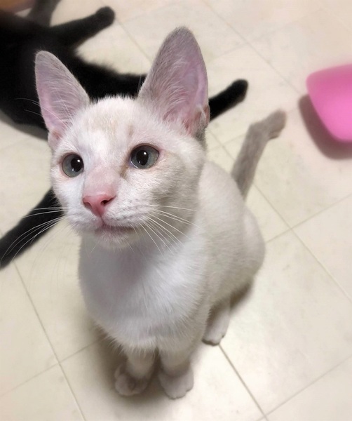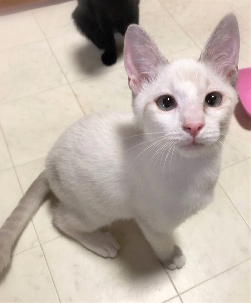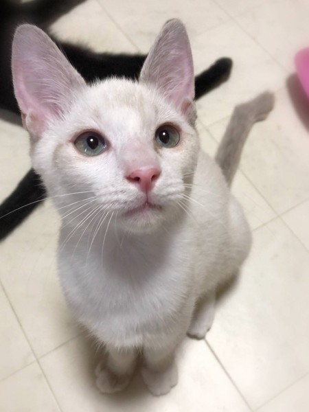 | 特徴(性格など) | 仮名、ボーズ 明るい青の瞳・被毛は白ベースで、耳足先シッポは濃淡のあるアイボリーベージュの男の子 人が大好きな甘えん坊で、遊ぶ事も大好き。 初めての場所では最初は緊張した様子を見せますが、少しすると探検を開始。 環境になれると、いつも近くにいたい甘えん坊になります。 眠たくなると必ず横にやって来て毛繕い→しばらく膝に乗る→納得する→膝からおりる→ぴったり体をくっつけ眠る の、可愛い子です。 |
