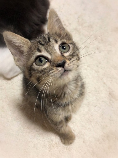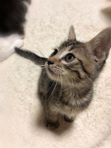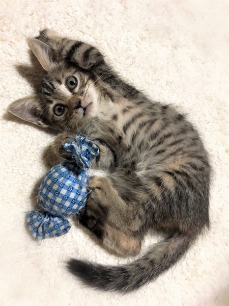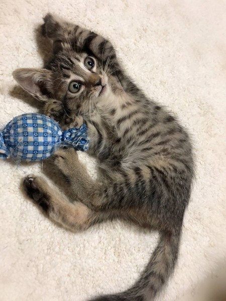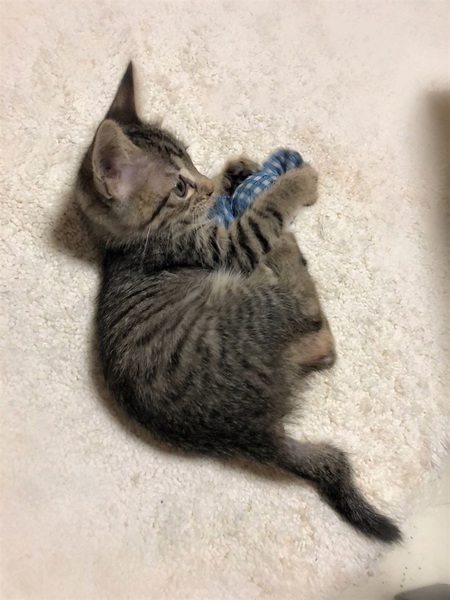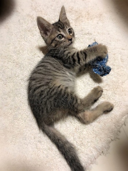 | 特徴(性格など) | 仮名ワープ しましまキジトラ 女の子。 とても人に馴れています。 ちび兄妹の中でも特に甘えん坊さん。 お腹をくるくるマッサージするとこてんと横になりゴロゴロ とても可愛い子です。 |
