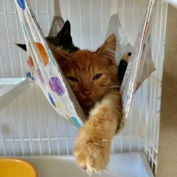 | 特徴(性格など) | ちょっと兄弟より小さい子でしたが、保護されてからは毎日モリモリ食べて、追いつけ追い越せ。しっぽがふわりとしているので、半長毛のようです。まだまだ家猫修行中で、心細いようなので、兄弟のかのこちゃんと一緒にいれたら嬉しいです。 | ||