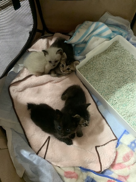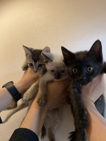 | 特徴(性格など) | 目が開くか開かないかくらいの時に保護して哺乳瓶でミルクをあげて育てましたのでとても人間慣れしています。爪切りにも慣れて、トイレも学習済みです。3匹ともオスです。 | ||