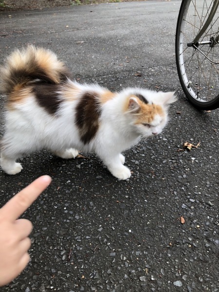 | 特徴(性格など) | 三毛の長毛です。顔は毛のせいかすこしぺちゃんこ顔です。 すてられたあては地域猫ですが、とてもなつっこく誰にもスリスリ寄っていきます。 |