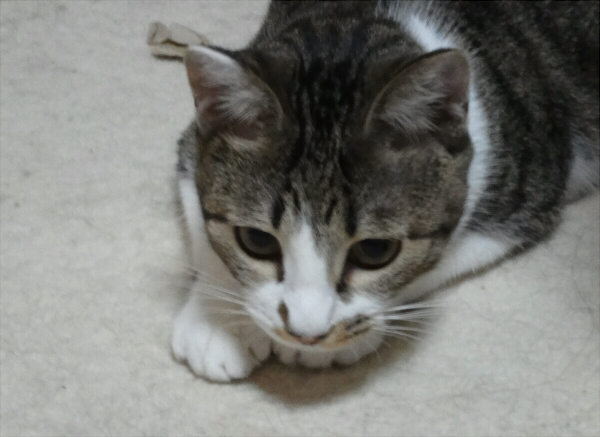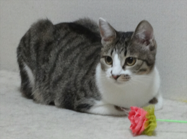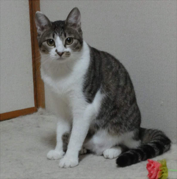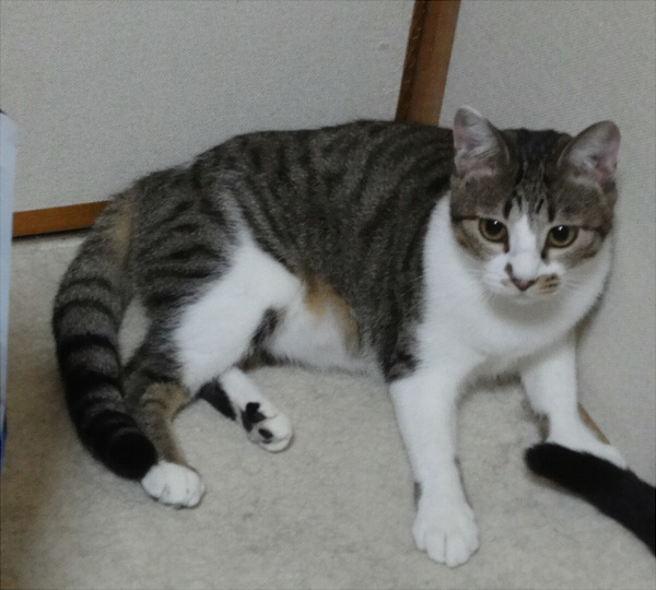 | 特徴(性格など) | キジトラ白のメスです。白い手に黒い肉球がとても可愛いです。 後ろ足は片方がレッグウォーマーを履いたようにキジトラ模様が長めです。 しっぽがとても長いです。 あまり鳴きませんが、鳴くときは小さな声でピャピャッという感じです。 膝に乗せて撫でるとゴロゴロいいます。抱っこで爪切りもできます。 時々舌をしまい忘れます。 |