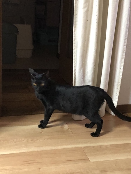 | 特徴(性格など) | 艶々のとても手触りのよい毛並みです。 しっぽがスラリと長い黒猫女子です。 警戒心はちょっと強めですが、顎の下を撫でてもらうのが好きです。 大人猫や自分より幼い子猫とも仲良くしています。 お腹にちょっと、白い所があります。 |