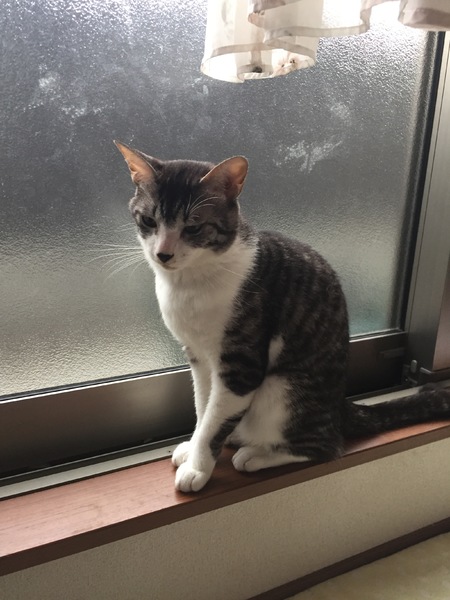 | 特徴(性格など) | 黒の虎模様。 大人しく、比較的いい子。 甘える時は膝の上に乗り、ゴロゴロ鳴らして頭撫でてもらおうとする。 |