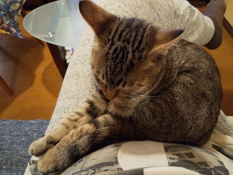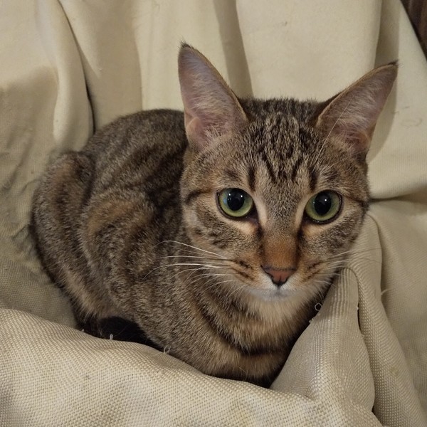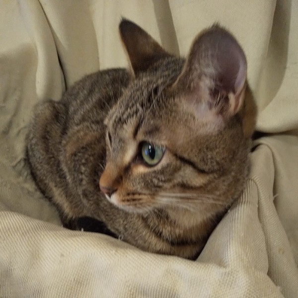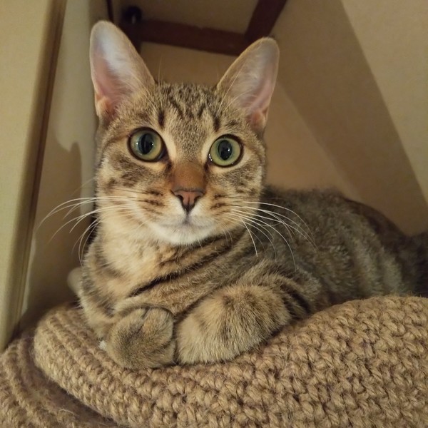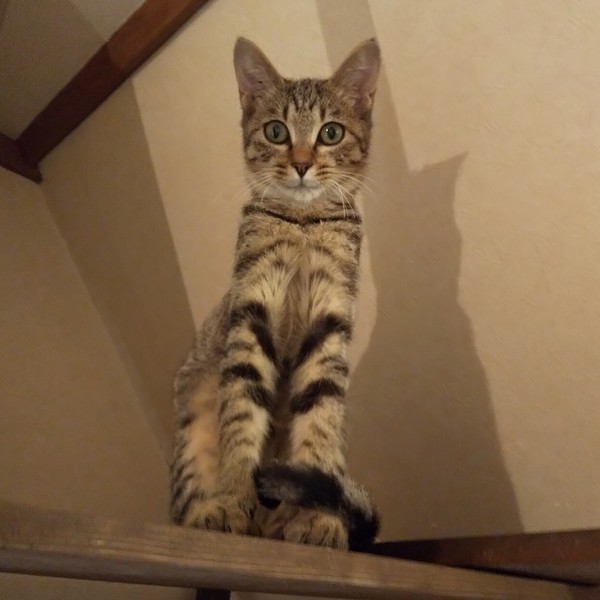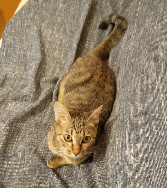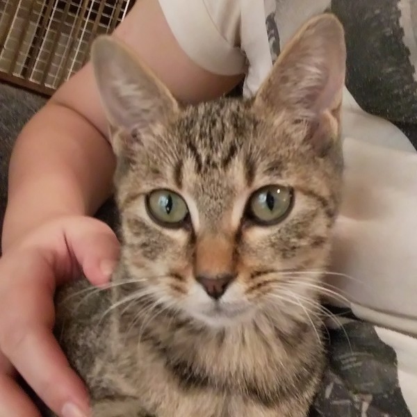 | 特徴(性格など) | 仮名:ユイ 毛色:茶色多めのキジトラ 瞳の色:薄いグリーン 尻尾:長くて真っ直ぐ 性格・特徴:兄妹の中で一番人懐っこく、保護後2、3日のうちにゴロゴロの甘えん坊になりました。 おひざ抱っこが大好きで、いつもひざの上でゴロゴロ言っています。 布団に入るとすぐにやって来て一緒に寝てくれます。 システムトイレのしつけ済み。 先住猫のいるお家か、2匹ペアでの譲渡をお願いします。 |