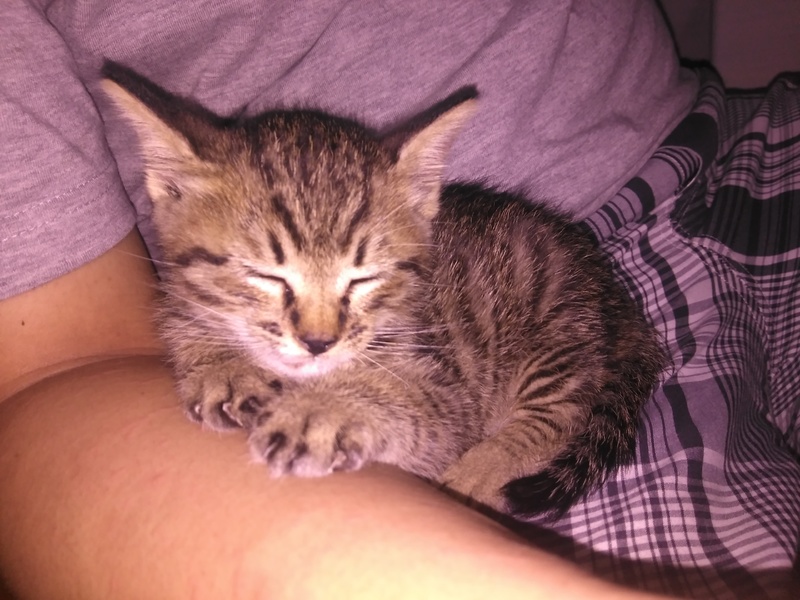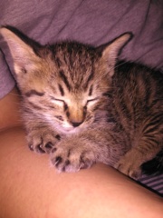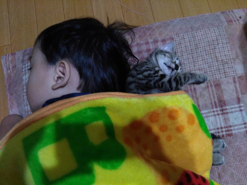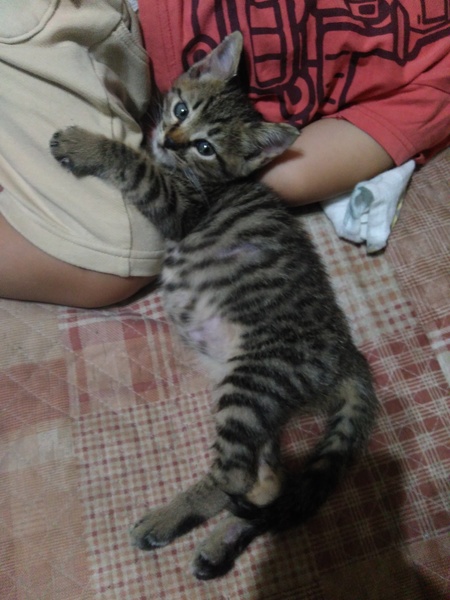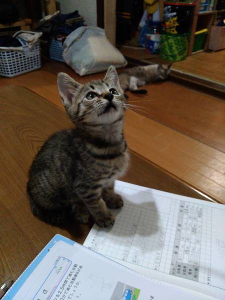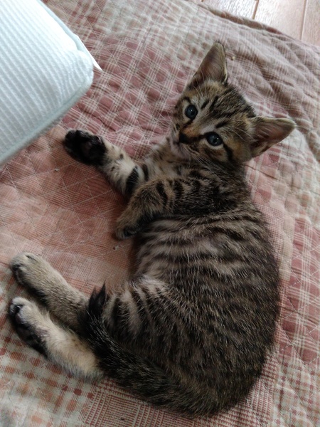| 特徴(性格など) | キジトラ(茶色いトラ模様)猫です。 お腹まで模様があり、肉球は黒いです。 子猫ですので性格は確定ではありませんが、活発な物怖じしない子猫です。 やんちゃ盛りな月齢なので、いずれ落ち着くとは思いますが、コップをひっくり返したり座布団や人を甘噛みもします(甘噛みは我が家のお兄ちゃん猫達に指導されていますが)。 また甘えん坊な所があり、気付くとお膝の上で丸くなっています。 寝るときも誰かにくっついています。 |