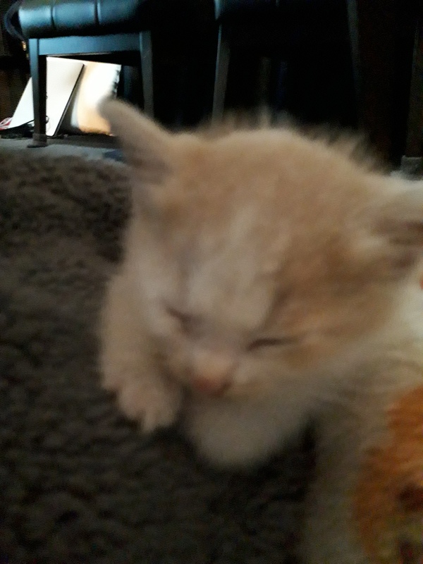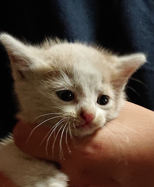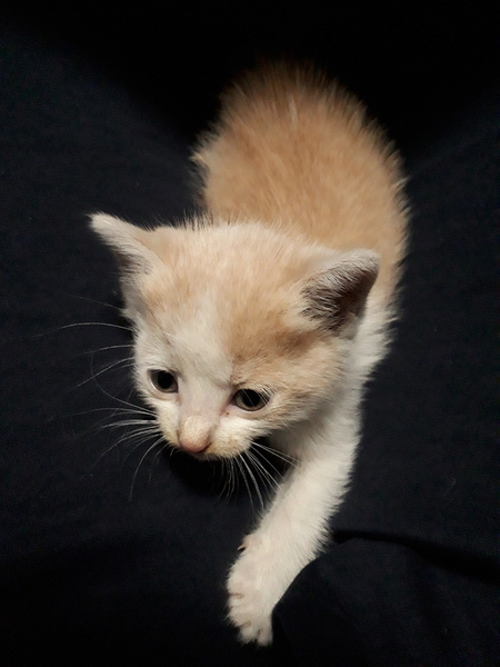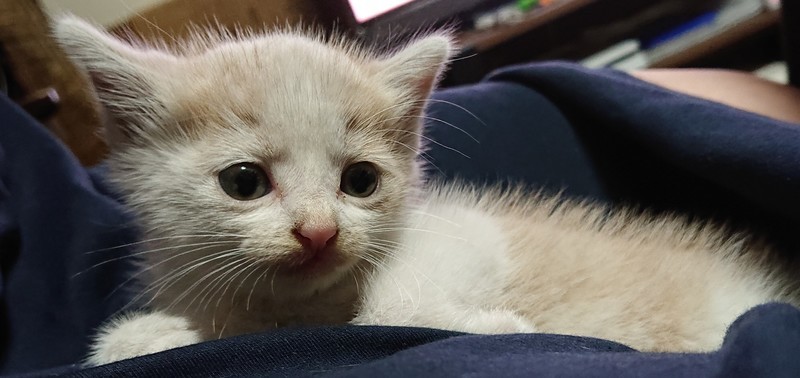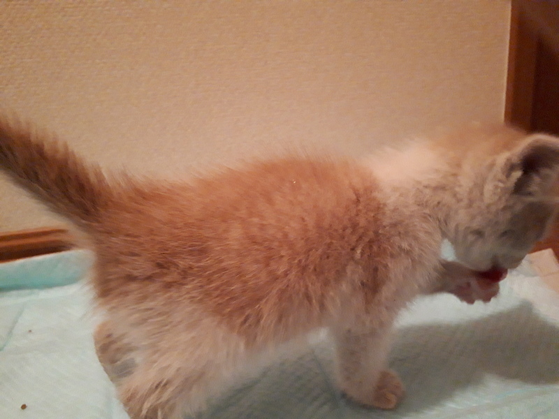 | 特徴(性格など) | 毛色はミルクティーのハチワレ 目の色はブルーっぽいグレー 肉球の色は全てピンク 性格は甘えん坊で好奇心旺盛、人懐こく家の隙間の中に入り込んで探索をしたり、少し遊んであげるとしばらく後をついていったり、就寝時や膝の上に乗せると寝ます。 乳歯が生えているので餌は現在、カリカリをふやかしたものを与えております。 |