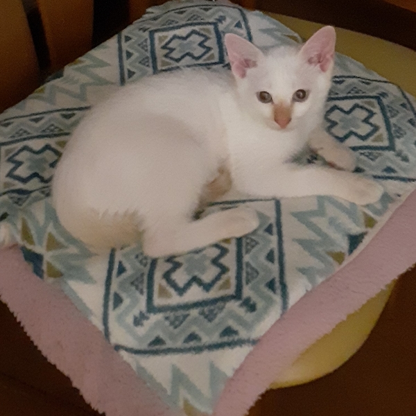 | 特徴(性格など) | 薄茶のシャムトラ、寝起きのおでこのシワが凄いです。個性的。 活発な女の子です、ごちそうさまの後はお膝に来ます。抱っこできます。ピンクちゃんから抱っこしてと来ることも。 |