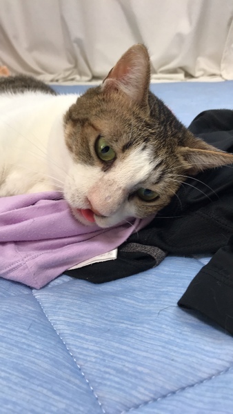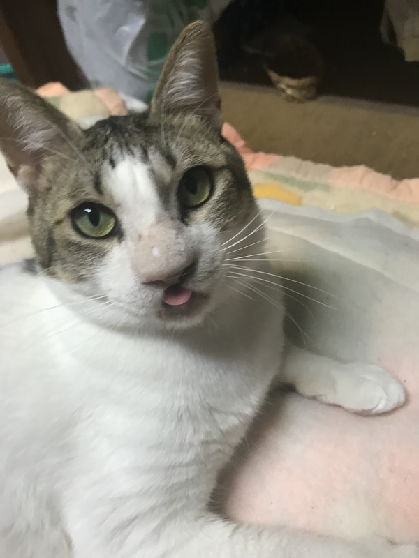 | 里親募集する理由 | 庭に来た時から、鼻が腫れており、2ヶ月くらい経った頃、目の形が変わるくらいまで腫れがひどくなり、膿みか涙か汁が垂れていた為、保護しました。 病院で、血膿を出してもらい腫れも引いてきましたが、完全に小さくはならなかったので、ガン等を疑い、骨や細胞、粘膜を採取して大学病院で検査をしましたが、異常がなかった為、募集することにしました。 |