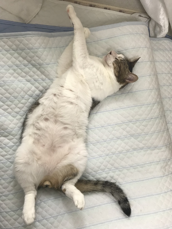 | 特徴(性格など) | ウサチュウ(仮名) キジ白。長い真っ直ぐなしっぽ。 エイズ白血病異常なし。 その他の血液検査、粘膜、軟骨、大学病院での病理検査、異常なし。 人懐こく猫にも人にもフレンドリー。 身体は大きいですが、子猫と対等に遊べ、どんな猫とも、馴染める猫で、セカンドキャットの素質があります。 とっても、お茶目で、甘えん坊で、順応性があるので、受け入れやすい子です。 鼻の軟骨が太く、あらゆる病理検査をしましたが異常はなく、子供の頃、鼻炎か事故等によって怪我をしたと思われます。正式譲渡の際は、病理検査の結果票を差し上げます。 前歯がない為、舌を出していることが多いです。 |