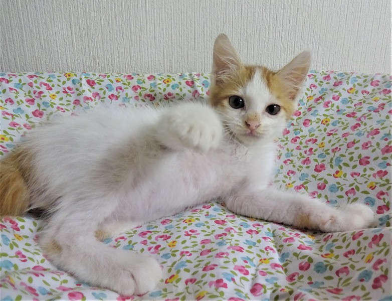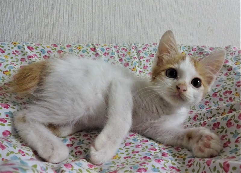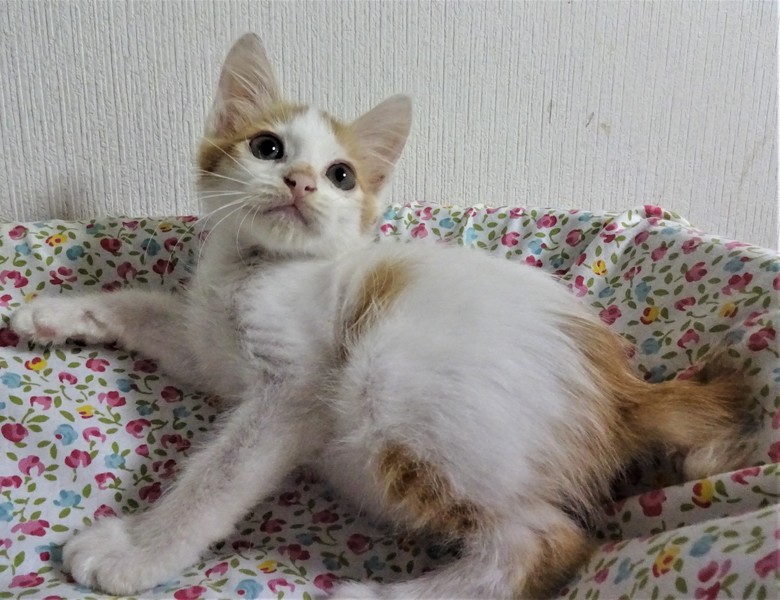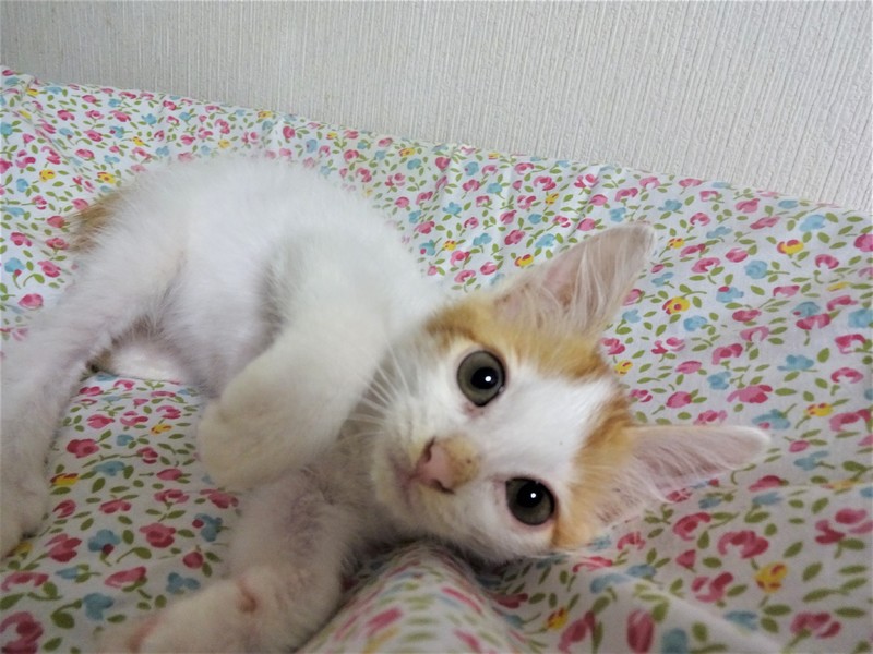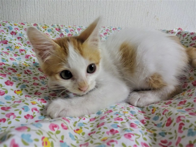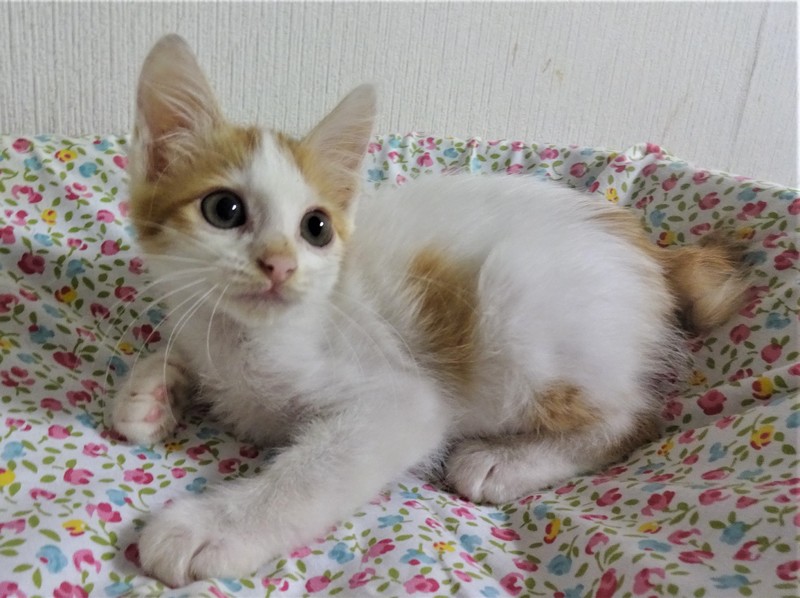 | 特徴(性格など) | 仮名:わたる君(オス) 毛色:白の多い白茶、尻尾短め 性格:よく催促で鳴きます。 遊ぼうよ、ご飯ちょうだいの催促をします。 ケージに近づくとゴロンとして甘えてきます。 威嚇もありません。 爪切りは嫌いみたいです。保護して日が浅く、他猫とどうかはまだわかりません。まだ小さいので、留守番時間の短いご家庭での見守りが必要と思いますが、4-5時間のお勤めでしたら問題ないと思います。 |