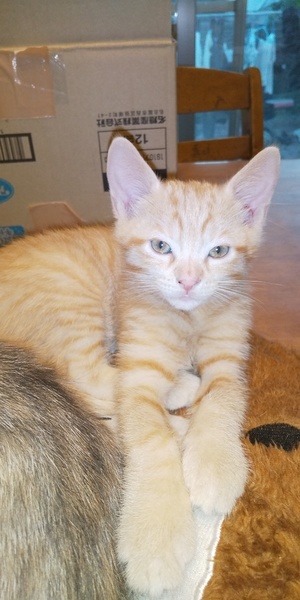 | 特徴(性格など) | 茶とらの男の子で、女の子のような優しい顔してます。 良く、走り回り、良く昼寝して離乳食を食べて、元気いっぱいな男の子です。 |
